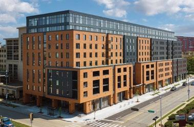 Developed by Hubbard Street Group, Skye on 6th features 309 apartments, 6,500 square feet of groundlevel retail space, and a 78,000-square-foot parking garage with 201 spaces. Its wellness-focused design also includes a fitness center with a sauna, steam room with outdoor pool and spa, as well as a dedicated coworking floor. Designed by Shepley Bulfinch for LEED Silver certification, the 357,850-square-foot building’s exterior cladding includes floor-to-ceiling window walls and fly-by EIFS panels.