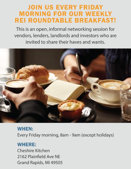 The Friday Morning REI breakfast is an open, informal networking session for vendors, lenders, landlords and investors who are invited to share their haves and wants.