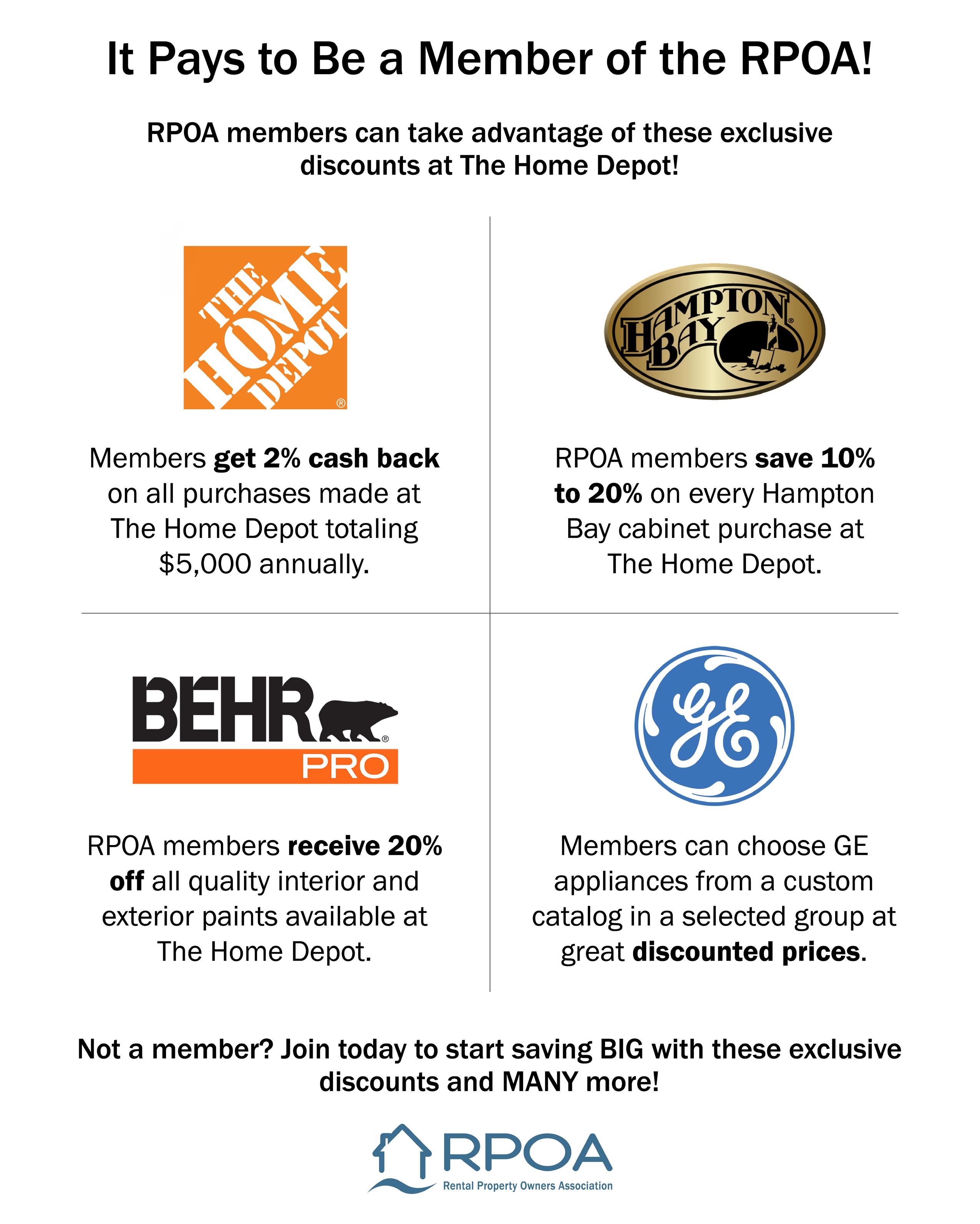THE HOME DEPOT Sign up for the Home Depot rebate program through the RPOA and receive a 2%* rebate on all your purchases—no matter how small or big. Call the RPOA office to get your rebate program started now! (616) 454-3385.