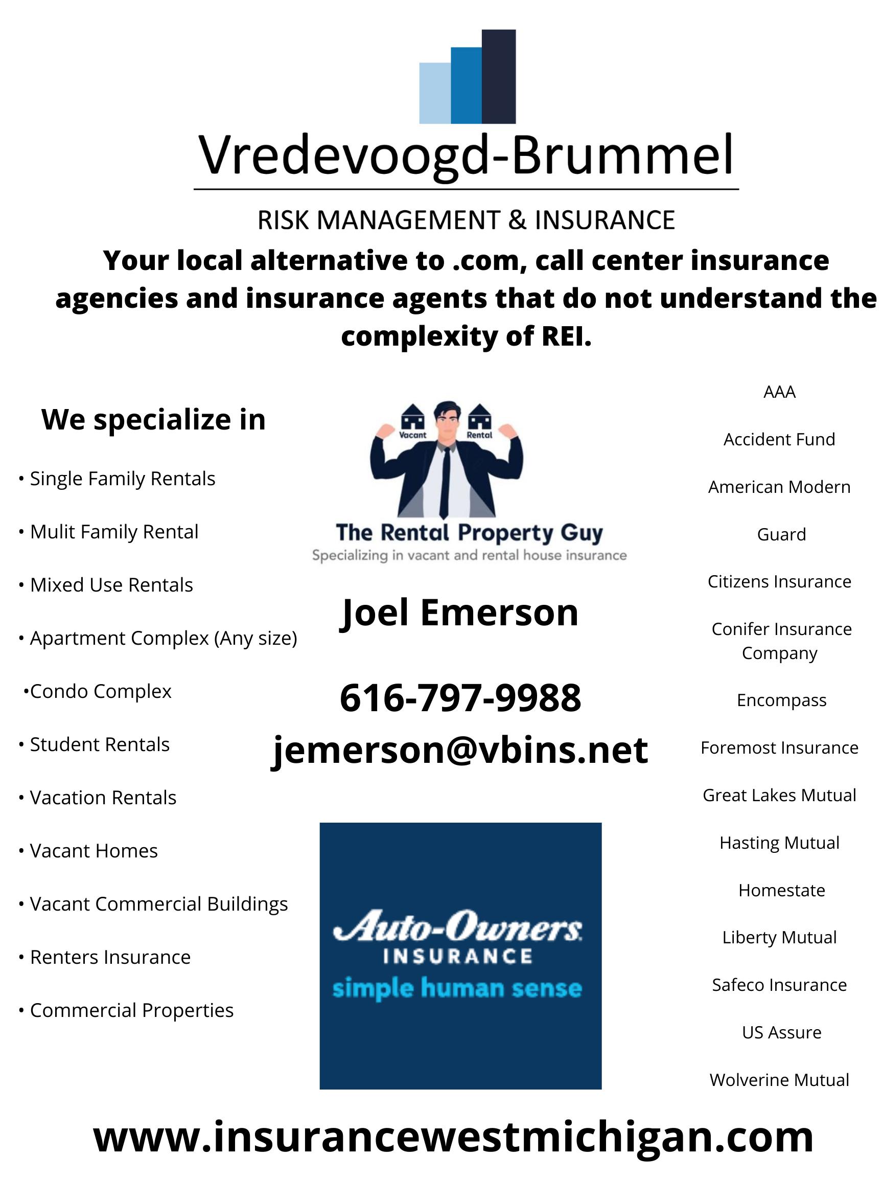 Independent insurance agency representing multiple insurance companies. Always providing home and auto insurance but specializing in rental and vacant property insurance. We do all the shopping for you and special RPOA member discounts are available. Call Joel Emerson at 616-797-9988 for more details.