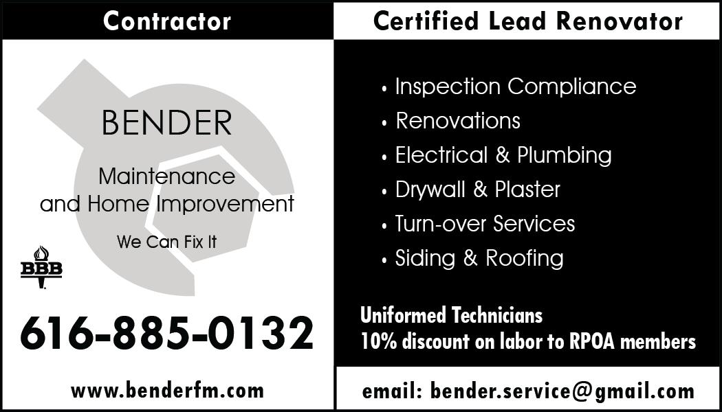 BENDER MAINTENANCE & HOME IMPROVEMENT 10% off hourly rate for RPOA members. Property maintenance, general repairs; prepare property to rent at acquisition; inspection compliance for Section 8, City of Grand Rapids. General Contractor, Certified Lead Renovator, RPOA Member. (616) 885-0132.
