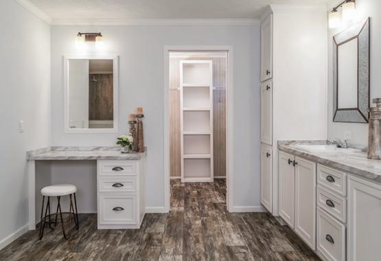 FEATURES: Multiple flex spaces and large bedrooms make the Cascade an instant crowd pleaser. A mixture of white and gray finishes, including marble-style countertops, makes for a fresh, clean look. A wall of built-in storage in the primary suite bathroom will have you feeling like a VIP.