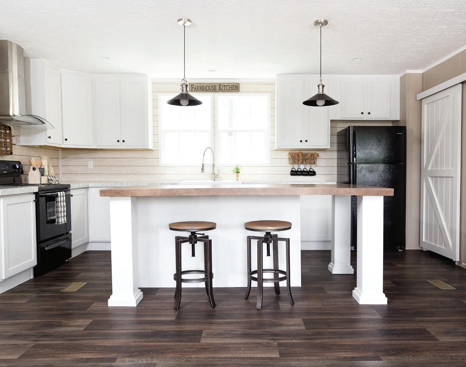 FEATURES: The Farmhouse Flex’s open floor plan features a breakfast bar with a view—talk about good mornings! Each of the two full baths has double sinks and ample storage. Better still: This model has the option to expand the primary bedroom and bathroom to fit your needs.