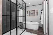FEATURES: A spacious primary suite, equipped with a soaking tub and freestanding shower, adds to the allure of the Platinum Anniversary. The floor plan boasts a kitchen that is both functional and beautiful with an island, split double sink and on-trend built-ins.