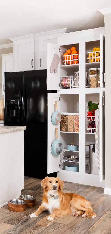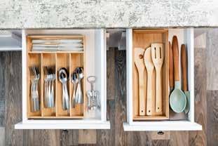 Don’t forget the back of the cabinet doors! Simply add adhesive hooks and—ta-da!— extra storage. This oftoverlooked piece of kitchen real estate is the perfect place to store slim-profile items such as pot lids, potholders, aprons and the like.
