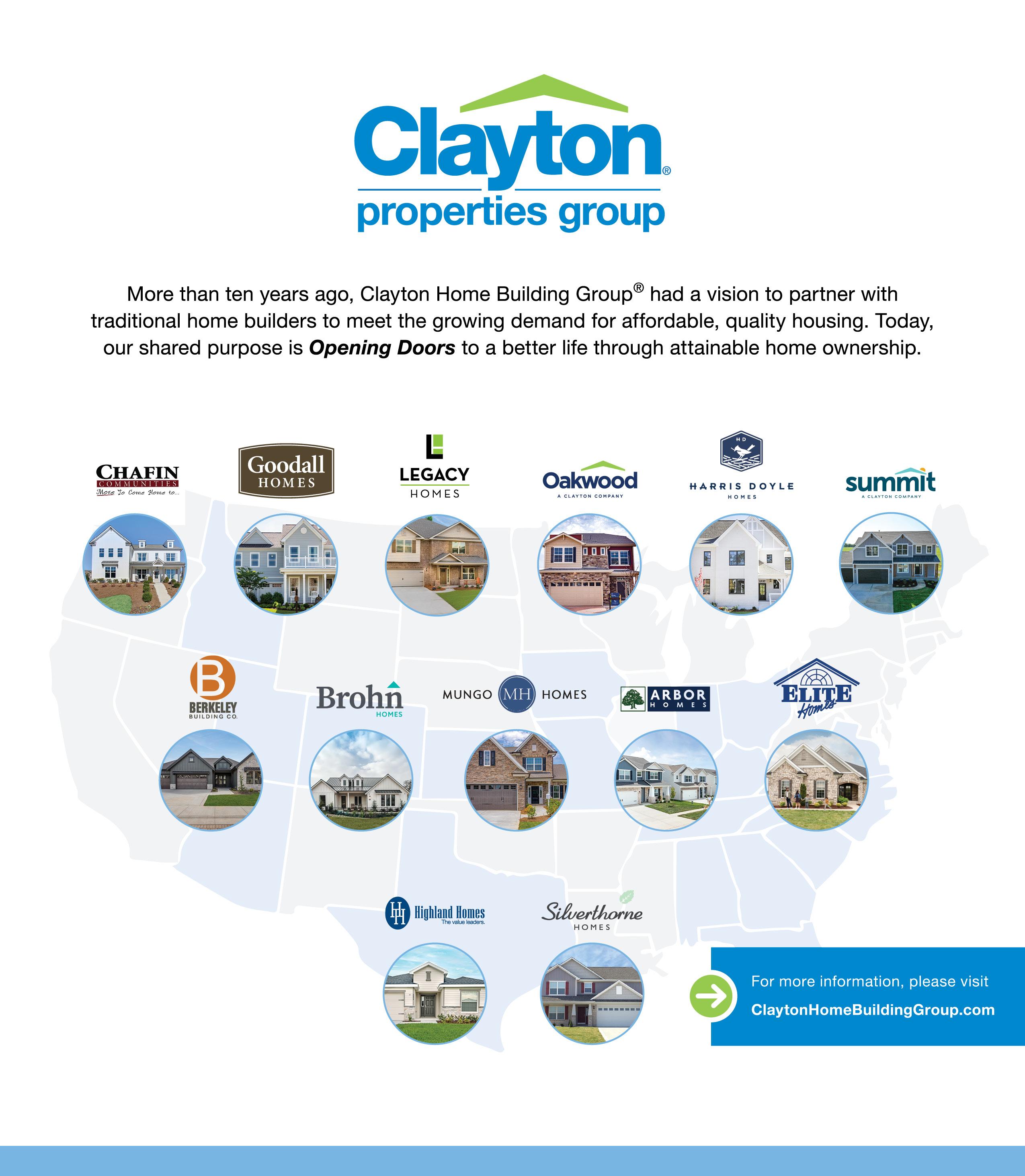 In our fifth edition of Clayton Home Building Group’s Opening Doors magazine, we’ve created an ode to the longest and hottest days of the year by celebrating our seasonal favorites, such as cold, decadent desserts (pg. 42), bright, cheerful color palettes (pg. 22) and favorite eateries to visit during your summer travels (pg. 18). If you stop by Chattanooga’s Clumpies or order it to your door (they ship nationally), try the butter pecan; you can thank me later. Also in this issue, you’ll find front-line stories from Clayton team members and beautiful designs from Clayton homes across the United States.