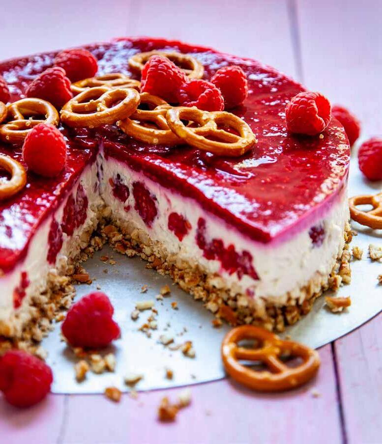 4. Stir the raspberry preserves into the cooled gelatin. (The raspberries will break a bit but will not dissolve and should be visible in the final cake.) Layer the gelatin mixture over the top of the cake. Refrigerate for at least 2 hours or until the cake has fully set. Top with the reserved pretzels and raspberries to serve.