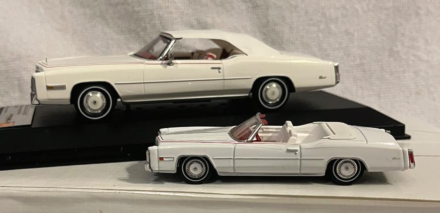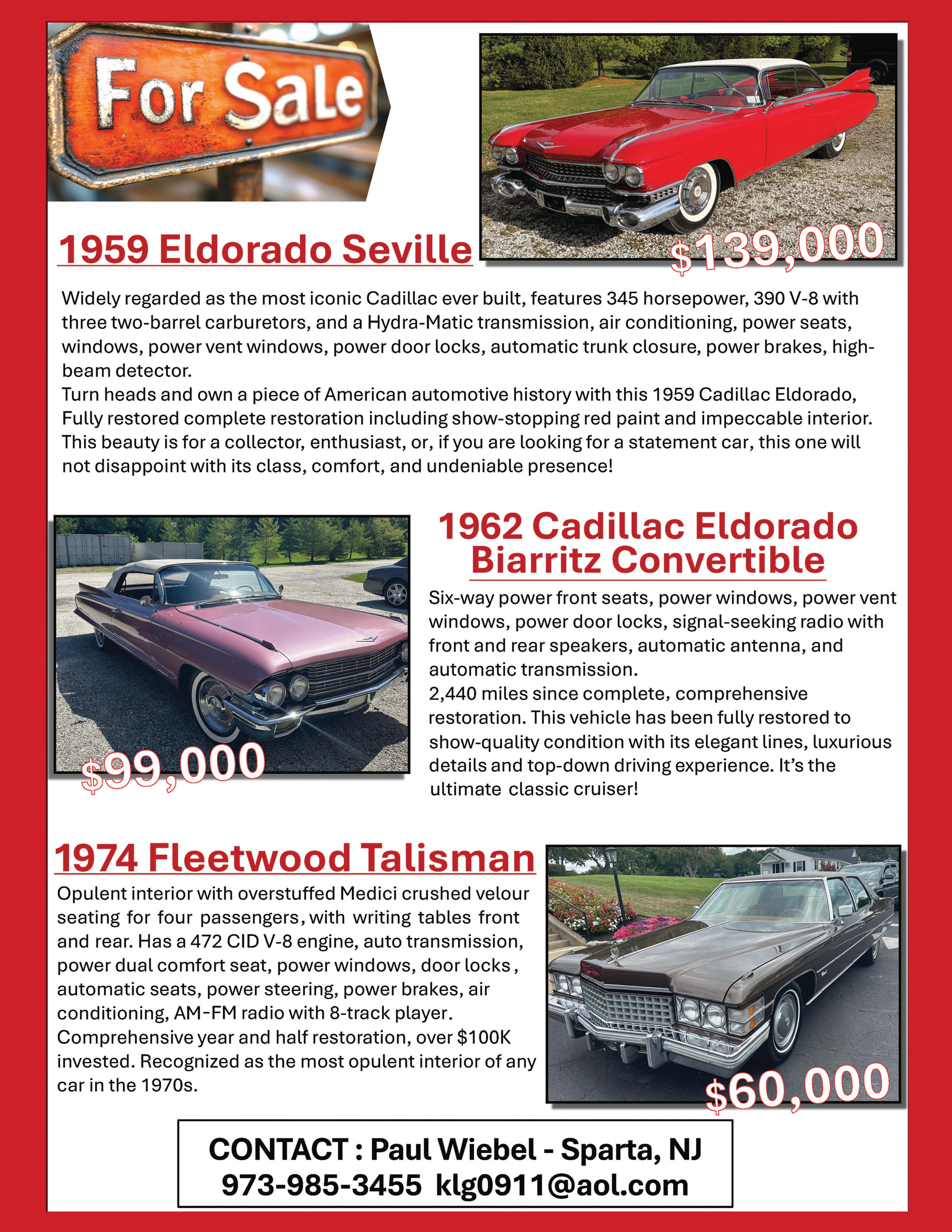 1959 Eldorado Convertibles. One of each Eldorados thru 1976. White with red leather interiors. Have 1972 and 1974. Bob Williams, Greenville, SC, 864-246-0318, email bob@ cadillaccreampuffs.com. 3/26