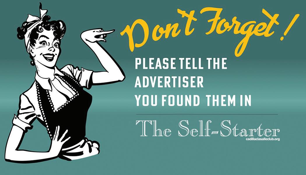 MISSION The official voice of The Cadillac & LaSalle Club, THE SELF-STARTER strives to serve the membership, providing avenues of communication pertaining to the preservation of Cadillacs and LaSalles and to foster camaraderie among its members.