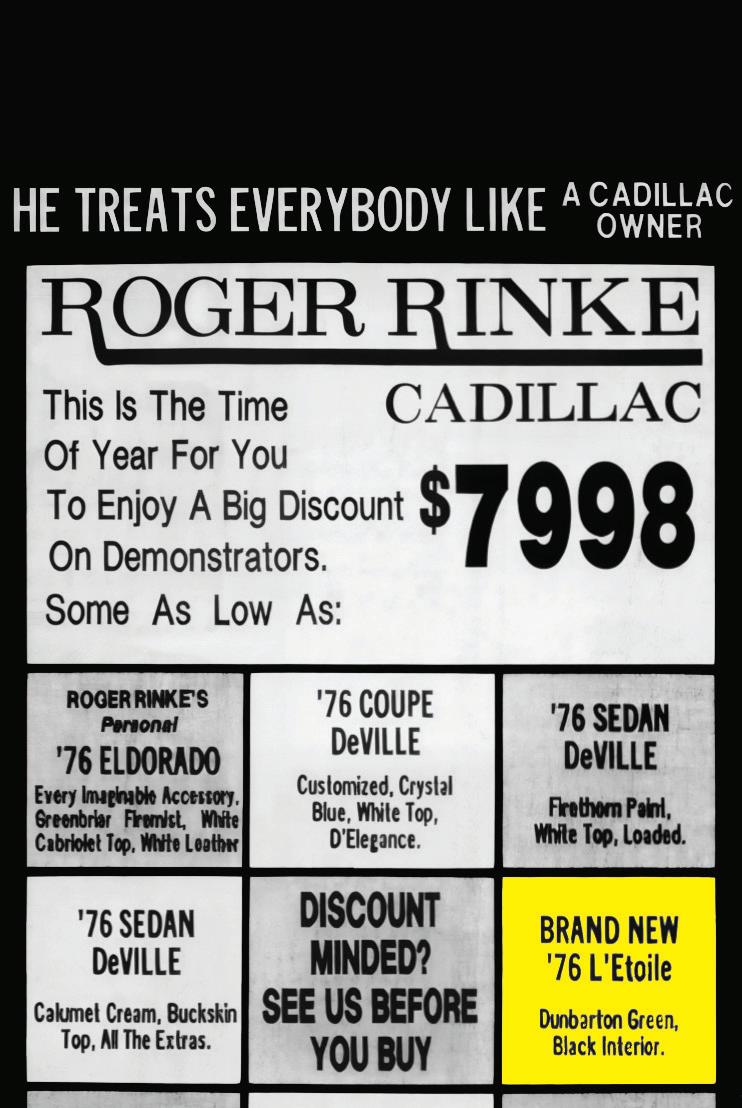 Flawless 1976 Salesman’s Merchandising Guide. 10-by-10-inch folded binder. Contains samples of all exterior colors and interior upholstery selections covering all 1976 Cadillacs. Includes Eldorado and Fleetwood Limo. $400 plus shipping. Lewis Cohen, Woodbridge, CT, 203-397-8723. 3/26