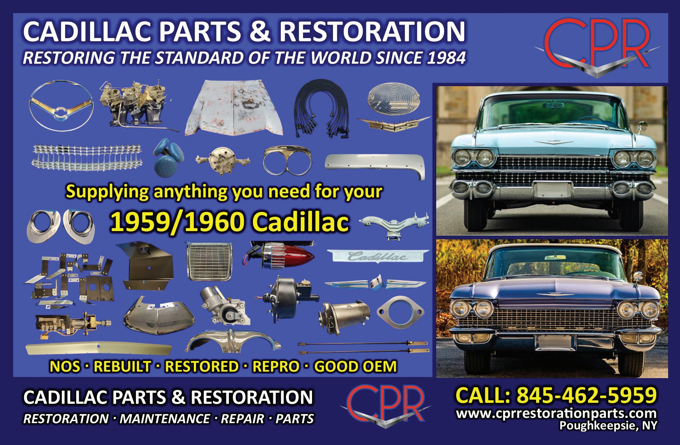 Classic Cadillac parts: NOS, rebuilt, restored, repro and good OEM. Since 1984, your trusted parts source for 1940s–1970s Cadillacs. 1959 and 1960 Cadillac parts a specialty. Cadillac Parts & Restoration (CPR), Poughkeepsie, NY, 845-462-5959, Monday–Friday 9–5 Eastern. 11/26