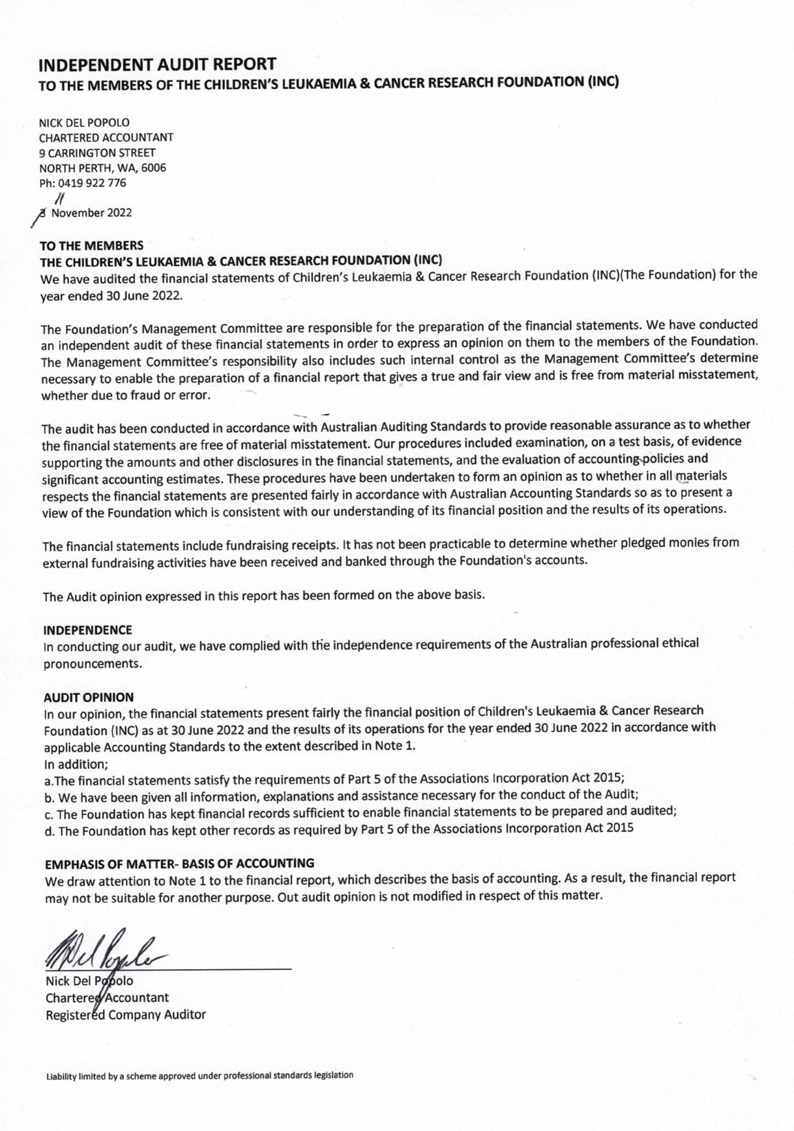 The Financial Report is a special purpose financial report, which has been prepared to meet the requirements of the Management Committee to provide information to the Children’s Leukaemia & Cancer Research Foundation (Inc). The Foundation is not a reporting entity and is not obliged to adhere to the mandatory reporting requirements of the Australian Accounting Standards. Notwithstanding the special reporting status of the foundation, the Management Committee have, unless otherwise stated followed generally accepted accounting principles in accordance with Australian Accounting Standards. The accounts have been prepared on the basis of historical costs and do not take into account the changing value of money. The Accounting policies are consistent with those prepared in 2021.
