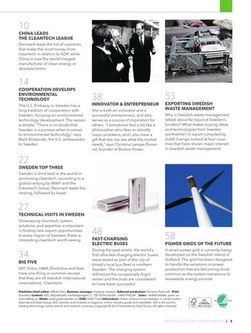 Publisher/chief editor: Mikael Salo, Business manager: Ingemar Jansson, Editorial production: Dynamo Press AB , Print: Elanders, Contact: IDG, Miljöaktuellt, Karlbergsvägen77, 10678 Stockholm, +4687996249, , Sales: +4684536044, green.solutions@idg.se, Webb: www.greensweden.se, ISSN: 0345-763x Information: Green Solutions from Sweden is a brand within International Data Group, IDG, Sweden and includes a magazine, online industry guide and n ewsletter. IDG is the world’s leading technology media, events and research company. Copyright © 2012 International Data Group. All rights reserved.