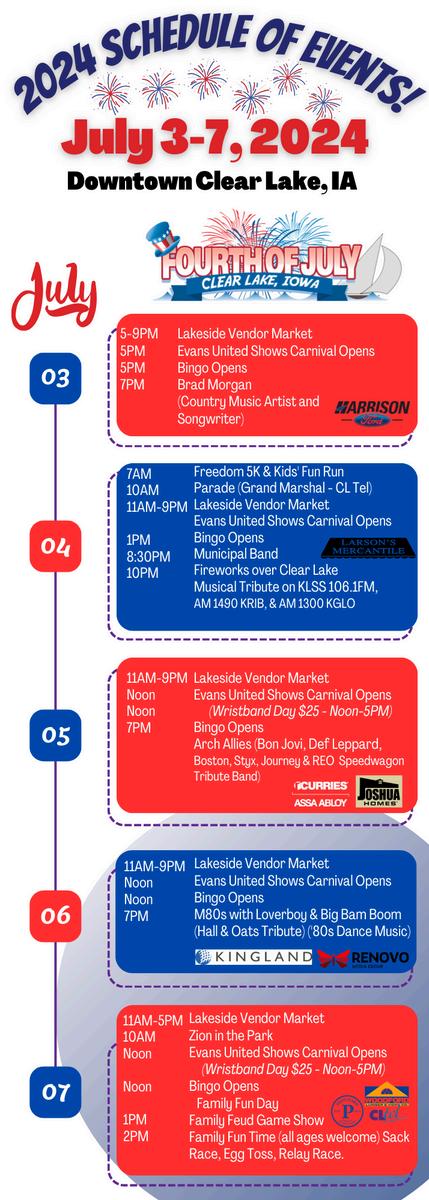 Our famous fireworks don’t happen without the help of volunteers The fireworks crew could use a few additional members on the Fourth of July. If you’re interested in helping, please reach out to Trish at 641-357-2159 or trish@clearlakeiowa com