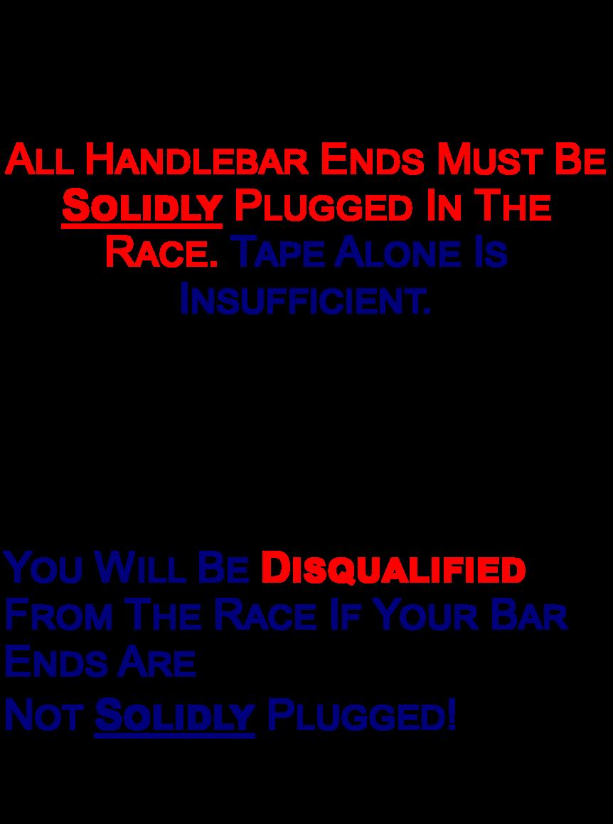 All equipment must be placed in the properly designated and individually assigned bike corral The wheel of the bicycle must be down on the side of the assigned space All participants must return their bicycles to an upright position in their designated bicycle corral No person shall interfere with another participant’s equipment or impede the progress of another participant All bar ends must be solidly plugged No participant shall bring ANY glass containers into the transition area.