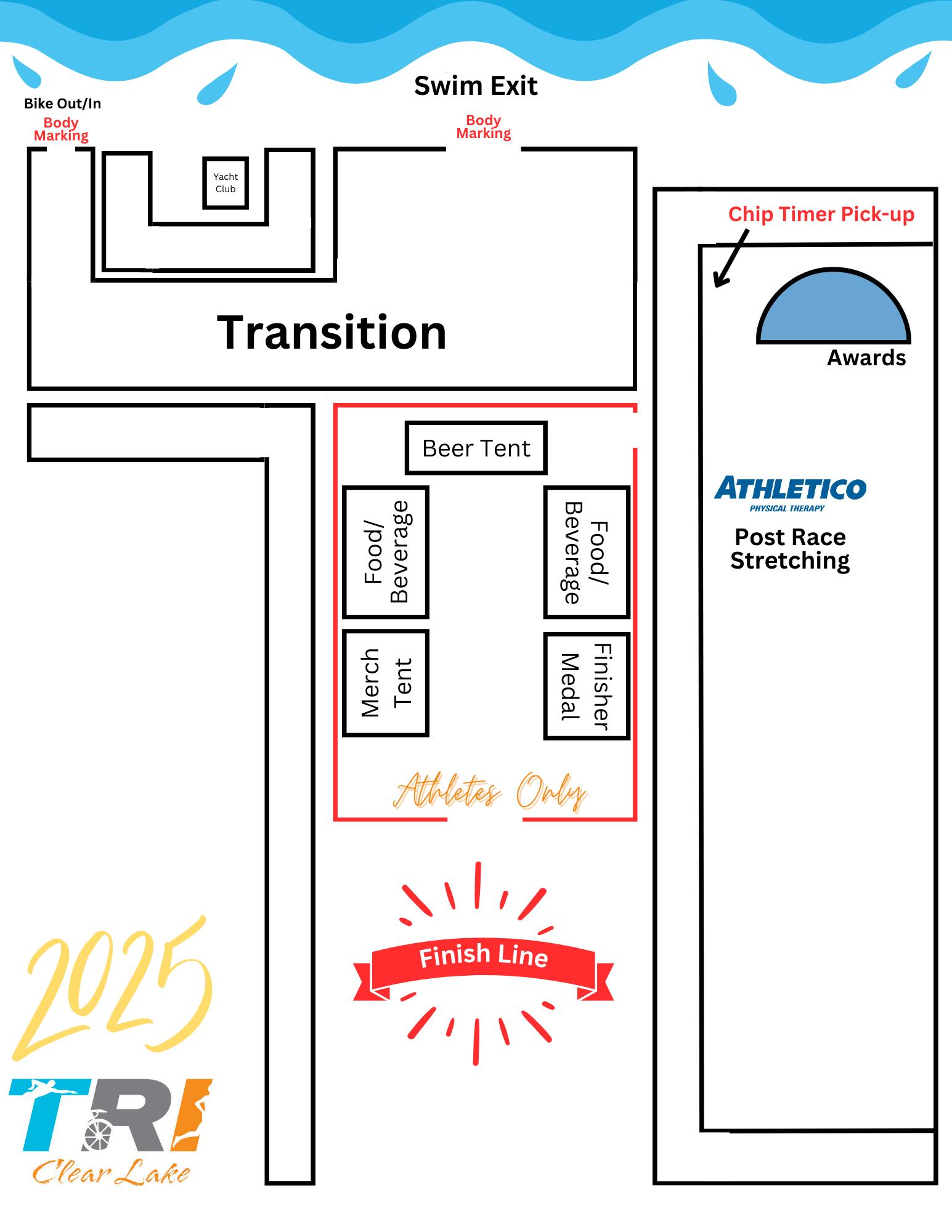 While participating in TRI Clear Lake, you are ultimately responsible for your own personal safety. Race day swim practice will begin when rescue boats, kayakers, and lifeguards are in the water at approximately 6:45am If you so choose, you may get into the water ahead of time at the public beach area; however, no assistance from TRI Clear Lake, will be present