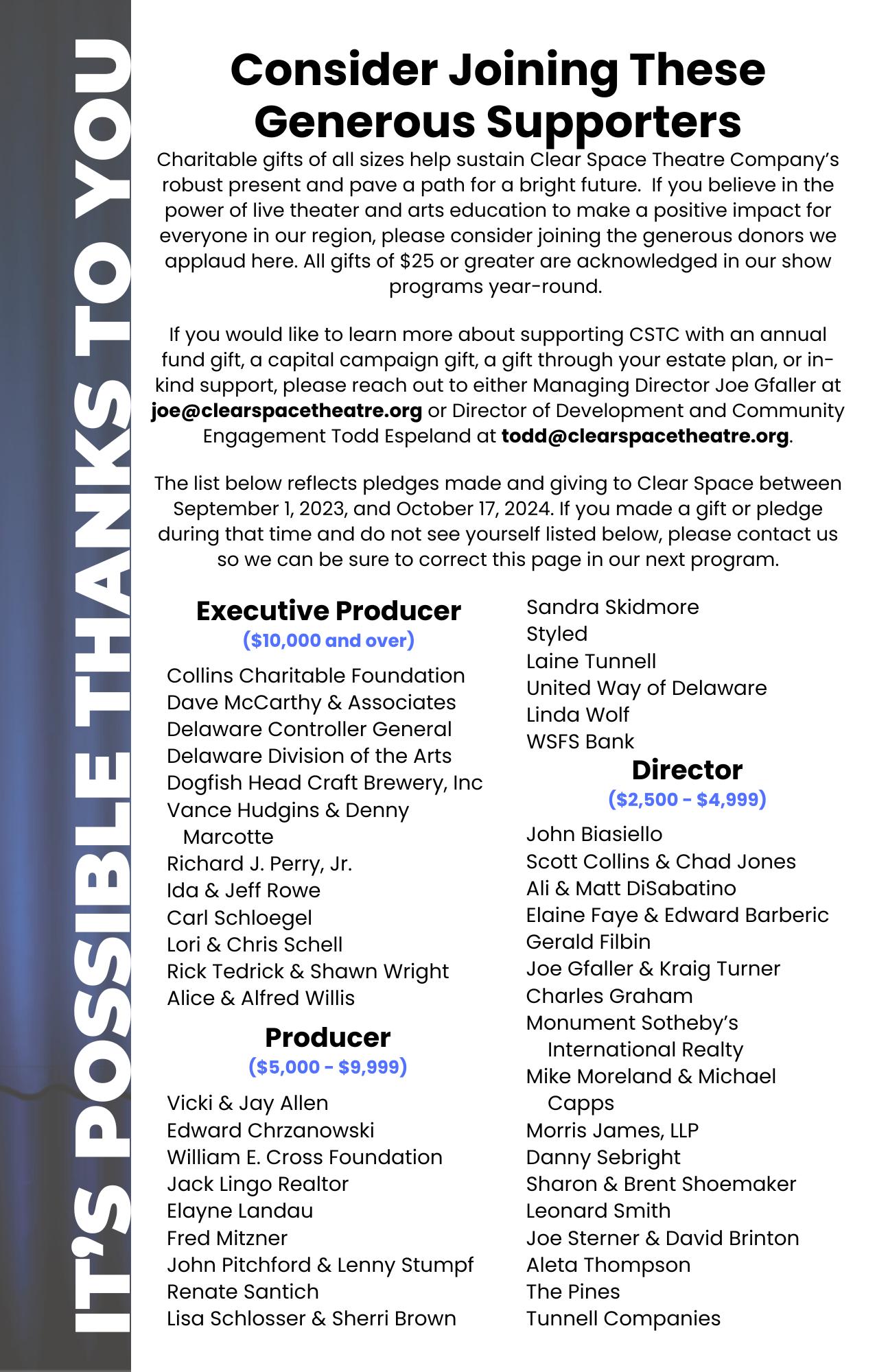 The Producers Circle serves as ambassadors for Clear Space Theatre Company to deepen its engagement within the community and to steward critical existing relationships in support of the organization. If you are interested in serving, please contact co-chairs Liz Leshine or Alice Willis or Managing Director Joe Gfaller.