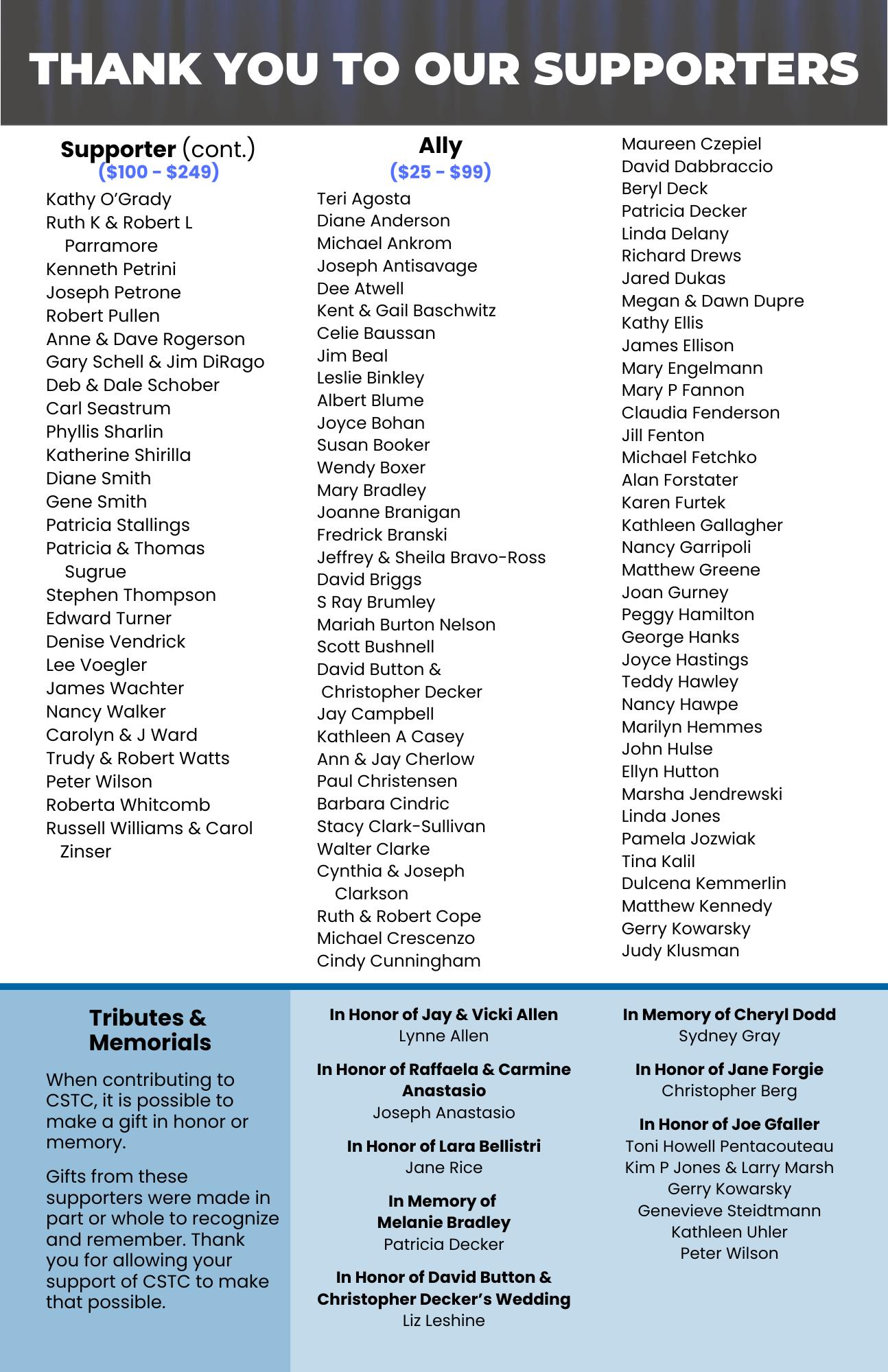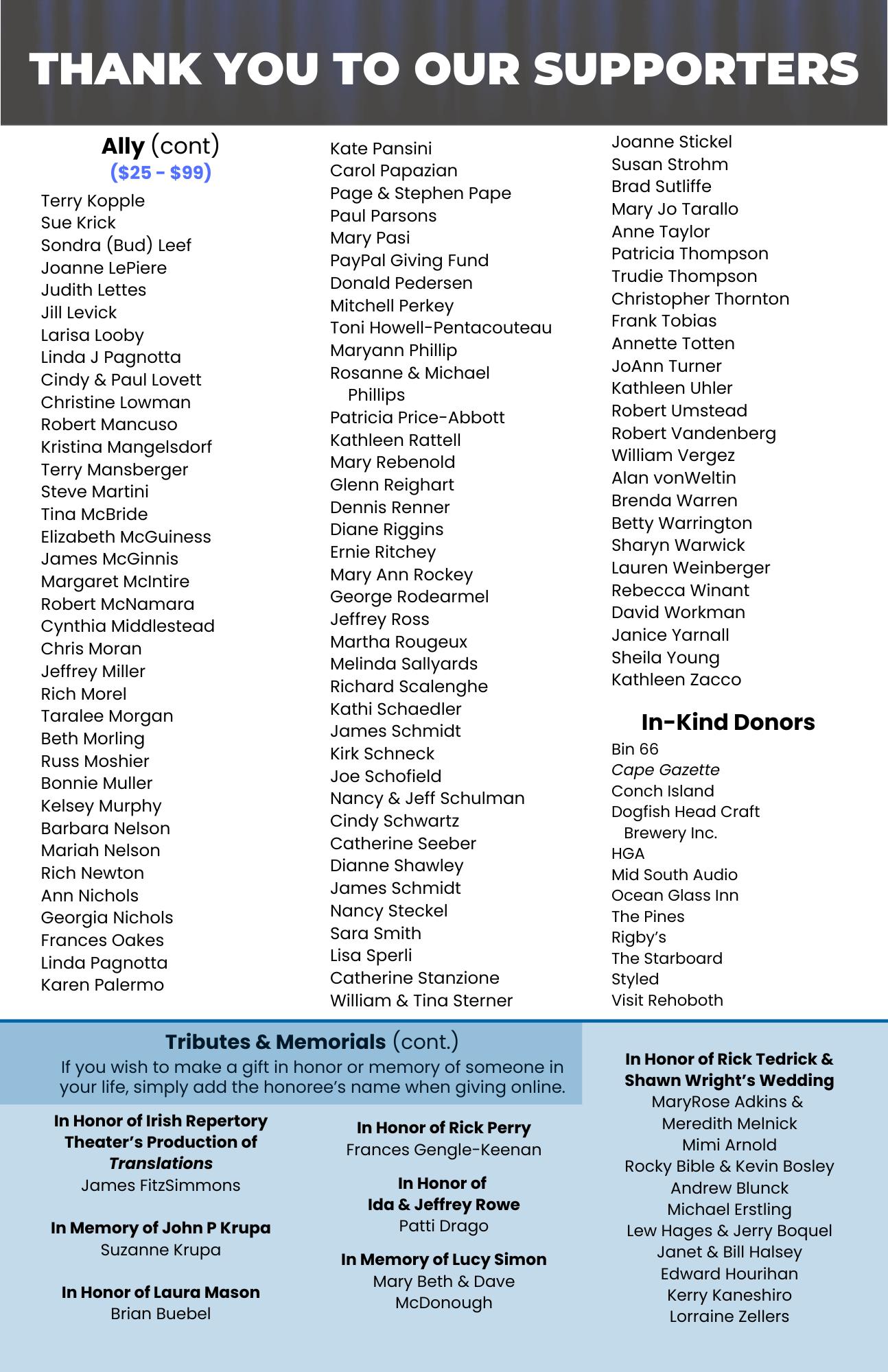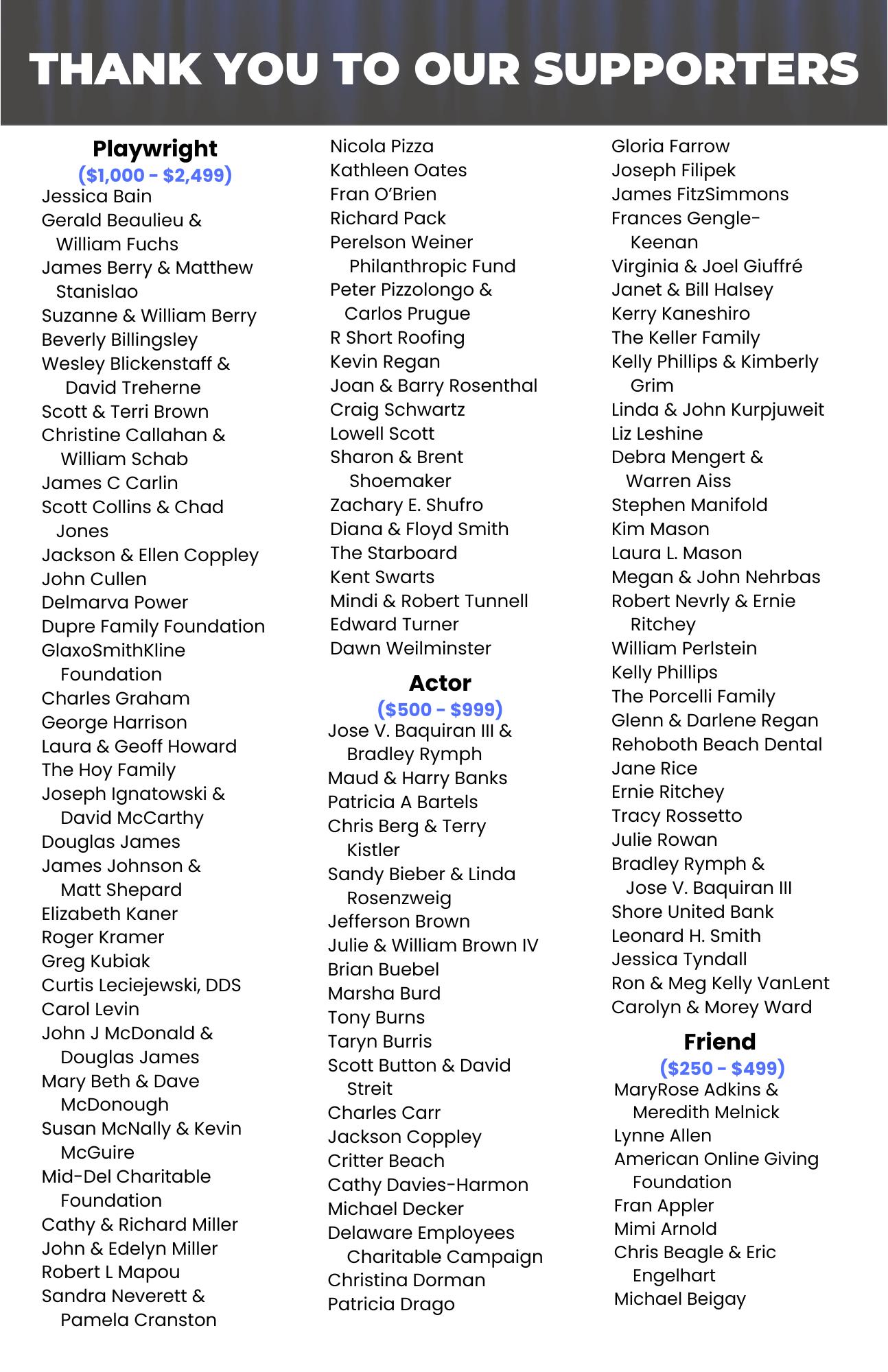 has performed at CST for over a decade, from Scroogeto Elf , with stops along the way at OurTownand MeetMeinStLouis . Also at CST: TheCrucible,TheSoundofMusic , and Miracleon34thStreet . He appeared Off-Broadway in Joe DiPietro’s OvertheRiverand ThroughtheWoods,as well as in that shows premiere at the Belmont Italian-American Theatre on Arthur Avenue in the Bronx. He lives in Lewes and wants to give a special thank you to his most supportive wife, Lorraine.