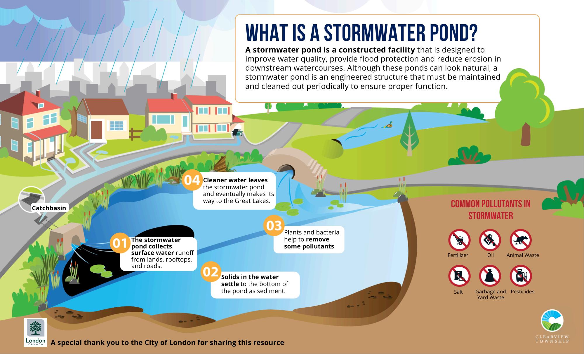 Stormwater is water that cannot be absorbed into the ground during rainfall and snow/ice melt events. Stormwater runs off of hard surfaces such as pavement or frozen ground, collecting anything in its path such as sand, soil, animal waste, fertilizers and oil/grease Stormwater needs to be managed to prevent flooding, downstream erosion, and water quality degradation There are various ways in which stormwater is managed in our Township including, roadside drainage through ditches and storm sewers, overland ditch/channel systems, and stormwater management ponds. In Clearview, all of the stormwater runoff travels to Lamont Creek, Batteaux Creek, Black Ash Creek, and the Mad River and eventually reaches the Great Lakes. Over time, sediment will accumulate in the stormwater pond reducing the pond’s ability
