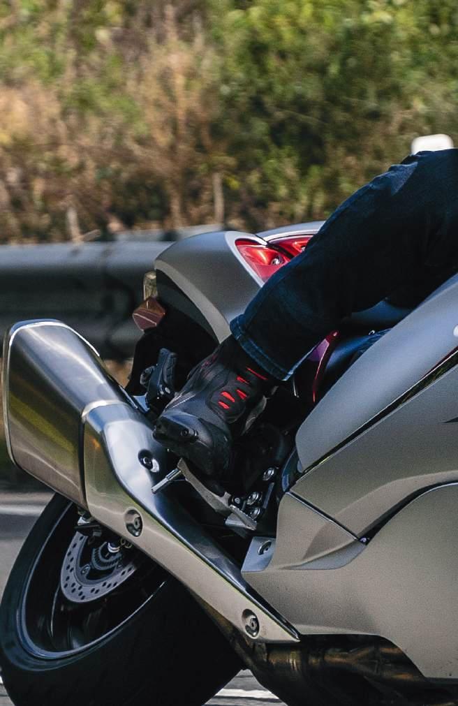 We got to test the Busa on a private road and don’t for a minute think this bike isn’t fast – it still pulls like a train for that nightly news stardom. Making things faster is an up/ down quickshi er, and on a premium motorcycle like this that is mandatory. You might have also noticed there’s a new exhaust system. e headers are very slightly di erent in shape but the mu ers are the big change. ey are much shorter and very similar to the mu er on the current GSX-R1000. I’m sure many owners will ditch them anyway, but having these more stylish standard mu ers is great. e old ones