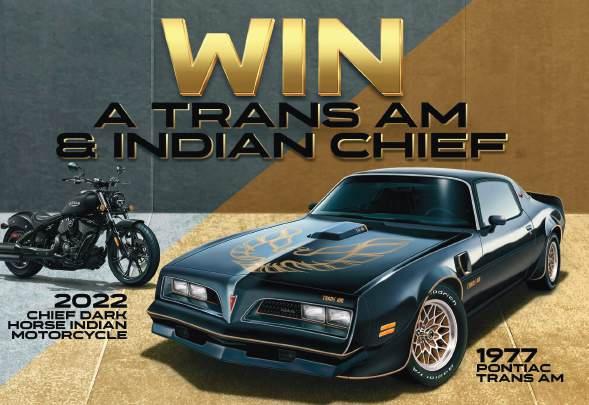 Shannons is giving motoring enthusiasts the chance to win two automotive icons – a 1977 Pontiac Firebird Trans Am and a new Chief Dark Horse Indian Motorcycle! e prize includes 12-months Shannons Comprehensive Car and Bike Insurance and Shannons Roadside Assist. Plus $5000 cash for eligible Shannons Club Members. You could win up to a massive $110,000 in prizes!