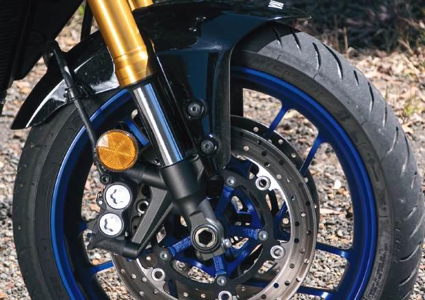 varying throttle response and power. Mode 1 is full power and sharpest delivery, through to Mode 4 which makes it feel like it’s only using two out of three cylinders, and three rider aid modes (TCS 1, TCS 2 and Manual), all accessed via the left-hand switchgear. TCS 1 is the lowest intervention on all aids, TCS 2 ramps it up a bit, and Manual allows you to tailor the whole lot to your tastes, with a choice of three intervention levels for each. The 6-speed transmission has an assistand-slipper clutch and a new up/down quickshifter, which works as sweet as a peach – even at low speeds.
