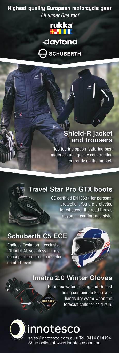 This publication is copyright. Other than for the purposes of research, study, criticism, review, parody or satire and subject to the conditions prescribed under the Copyright Act 1968, no part of this publication may be reproduced, stored in a retrieval system or transmitted without the prior written permission of Australian Motorcyclist Magazine Pty Ltd. Opinions expressed within this publication do not necessarily represent those of Australian Motorcyclist Magazine Pty Ltd. No responsibility is accepted by Australian Motorcyclist Magazine Pty Ltd or the editor for the accuracy of any statement, opinion or advice contained in the text or advertisements. Readers should rely on their own enquiries in making decisions tailored to their own interest.