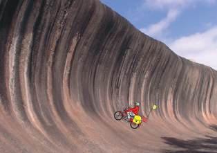 As the rear of the bike bounces back up from the pothole, the contents of the panniers rip off the lids and keep going. A perfectly pannier-shaped column of food, clothes, tools and much more flies upward from each pannier, capped by the torn-off lid. The columns only last a second or so, then they disintegrate and my belongings are spread over a sizeable patch of the Newnes road. I get a major wobble up as I laugh madly; fortunately WLAs are inherently stable, so I come to a stop without falling over.