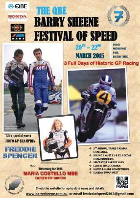 2015 Barry Sheene Festival of Speed Come out to Sydney Motorsport Park on the 20, 21 & 22nd of March to the Barry Sheene Festival of Speed and you will not only see some amazing classic race bikes and racing (including Stuart racing his CBR), but you’ll have the chance to see special guests Freddie Spencer and, returning this year, Maria Costello MBE. Not only is there racing, but you can get involved as well, with spectator laps of the circuit. The Show N Shine is always popular and a swap meet will be popular for those after hard to get parts. Check out the club and trade stands for all sorts of goodies. So come out and enjoy one of the best weekends of the year. Stuart will see you there! www.barrysheene.com.au