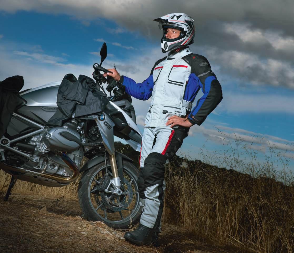 of the BMW building up a bow wave of leaf litter and gravel, while the tarred part of the surface grinds away at my leg. Fortunately I am wearing my Touratech Compañero suit, which takes the damage without passing any of it on to my leg, or for that matter my elbow.