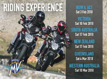 Many events and shows have been planned, starting with the National Riding Experience in Sydney on the 3rd of February (just past), which will continue through to the rest of States as follows – VIC - Saturday 10 Feb (also just past), SA - Saturday 17 Feb, New Zealand - Saturday 17 Feb, QLD - Saturday 4 Mar, WASaturday 10 Mar with TAS and NT to be announced soon. Visit www.mvagusta.com.au for more. D