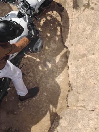 grasp the modes and settings, the GS's behaviour and ability can be matched to its surroundings. Most of us fl icked between the dedicated off-road settings of Enduro and the stimulating Dynamic road settings. As with every motorcycle here weighing over 220 kilograms I just never managed to erase from my consciousness that I was riding something that would damage me more than I would damage it. Respect the size and weight and know that the best riders out there can get a 1200 GS into places that normally only an enduro 450 can get to. Not on this ride and not me! As a touring adventure bike the BM has almost everything going for it.