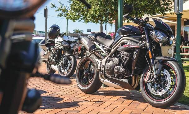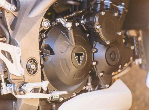 Ergonomics have also been looked at. A new “comfort” seat is fi tted which has 3D net inserts, medical grade foam and, for the visual aspect, nice red stitching. Seat to peg height is sporty but pretty good for all day riding and the handlebar has you with just weighted wrists. Accessories are extensive and will suit all tastes. The bikes we rode during the launch had the bidirectional quickshifter (as mentioned), rubber Triumph tank pad, frame protector kit and CNC machined fork protectors – sounds like Triumph doesn’t trust us or something? LOL!