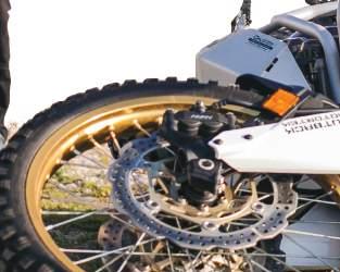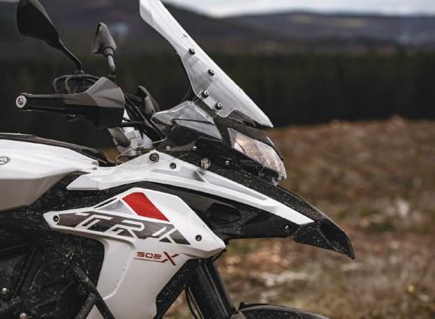 four pistons calipers. The reason behind the change in calipers is that Benelli saw the need to reduce initial bite for dirt riding. Having lived with the road going Leoncino for the last few months I found the reduced braking a bit of a shock to start with, but once we got to the dirt I understood the decision as the radial brakes would be a bit too much in slippery mud.