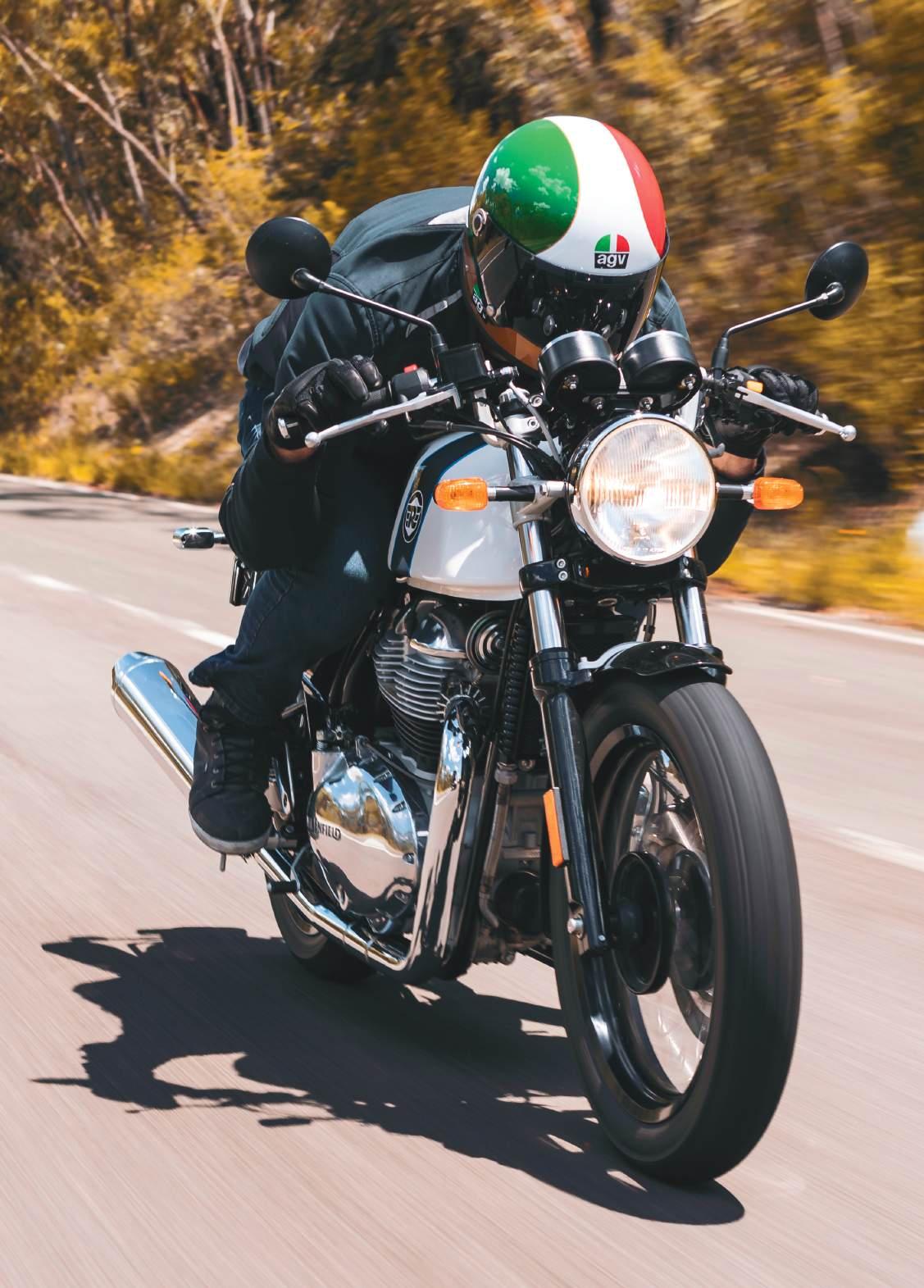 speak of above used to race 500GP for Padgetts Racing with a Harris frame, so with the Harris-made tubular steel chassis, Royal Enfield has gone the extra mile to make the Twins handle beautifully. The differences in design between the two bikes means they do handle slightly differently. The Interceptor is the sweeter of the pair; the additional bias on front weight created by the riding position of the GT takes away some of the agility. But if you hadn’t ridden both backto-back you wouldn’t know. The big thing to note here is the philosophy of being easy and simple to ride is what both bikes offer.