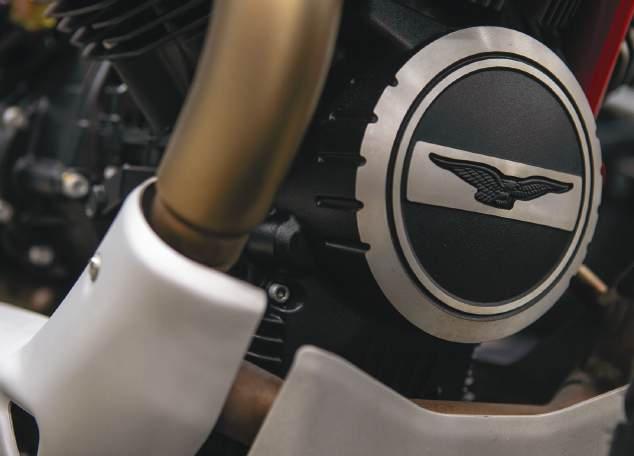 the Mandello Eagle. Engine capacity is 853cc, thanks to a bore to stroke ratio of 84 x 77 mm. Thanks to its complete new design and the use of materials generally destined for race bikes, such as titanium, the new “eight and a half” is able to deliver a maximum power of 59kW, as well as an impressive maximum torque value of 80Nm at 5000 rpm, with 90% of the torque already available at 3750 rpm - in keeping with the tradition of the Mandello twin, which has always offered excellent drive even at very low revs. This is the first Moto Guzzi small block engine that can easily reach 8000rpm, an aspect that showcases its modern and exuberant nature.