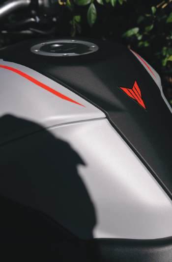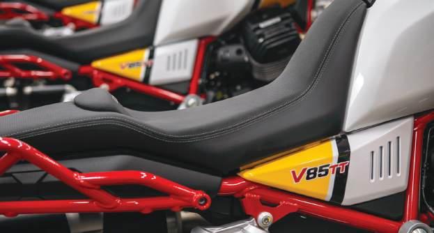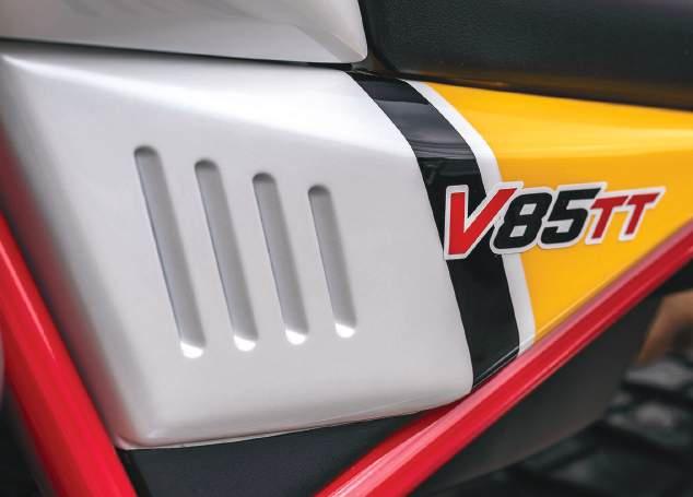 of lateral bulk. The right arm of the swingarm houses the new shaft drive transmission. V85 TT is the only bike in its segment to use shaft drive transmission, prioritised over a chain drive because it makes no mess and requires no maintenance.