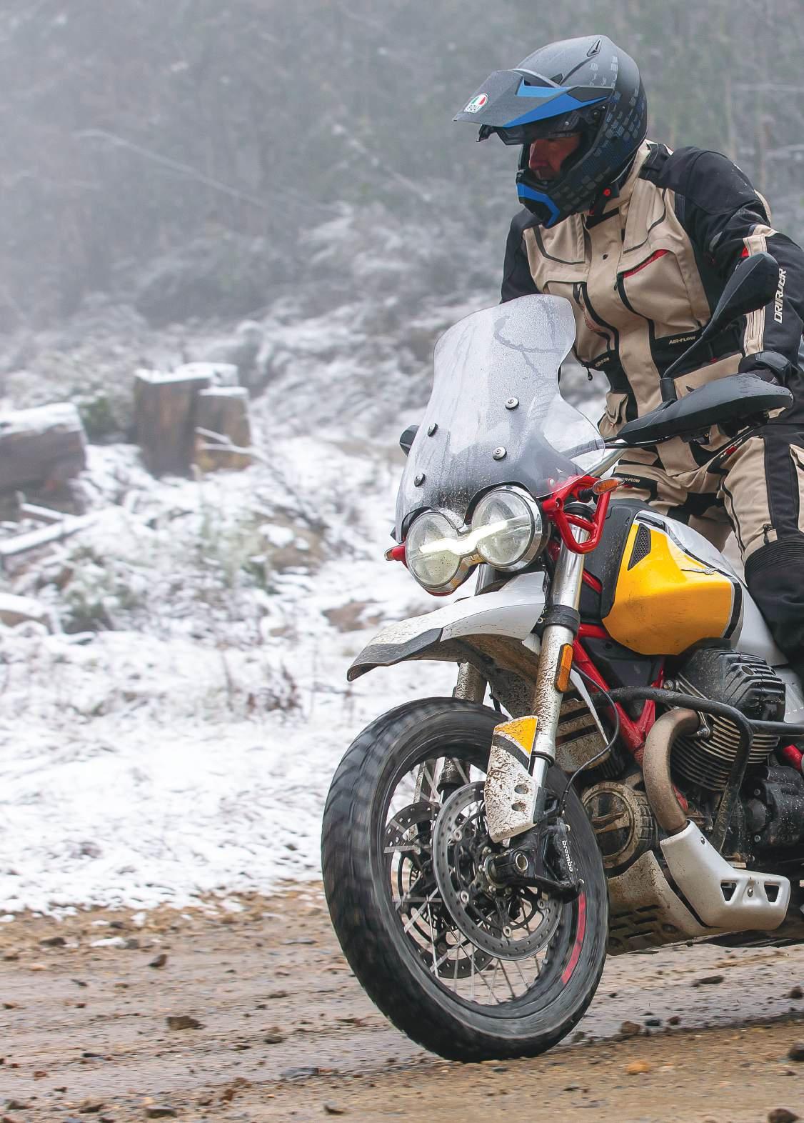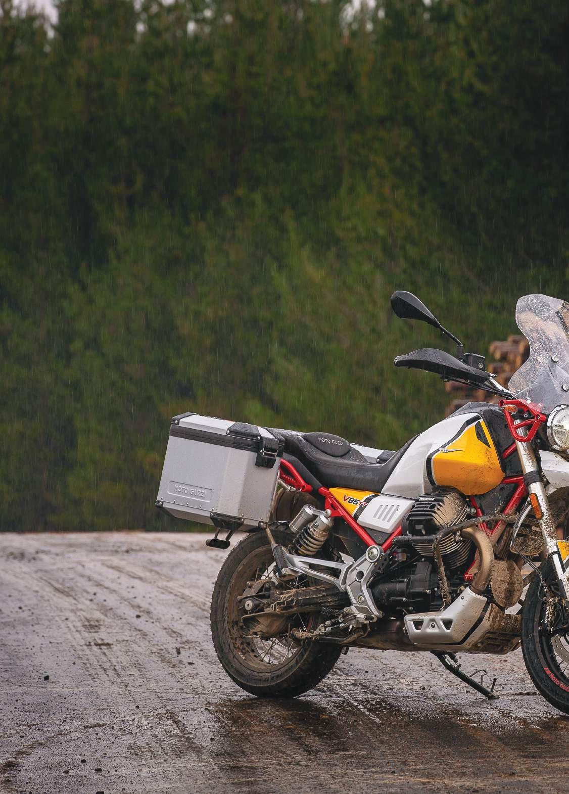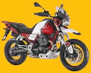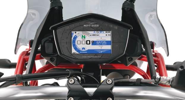 storage compartment. The high front mudguard and beautiful double front headlight are also in keeping with Moto Guzzi history, these stylish and functional solutions already present on the 1996 NTX 650 and the 1989 Quota 1000 respectively. Classic off-road style features (including fork stanchion protection, an exhaust system with high silencer and the aluminium engine sump guard) are combined with the digital instrument cluster and the series of LED lights on the headlamp with a DRL that traces the shape of the Moto Guzzi eagle. Handling boasts amazing solid and