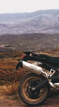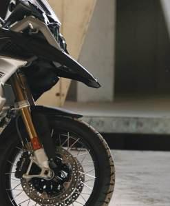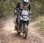 precise front end feel as it enters a corner with an ample rear for most sized riders. It is probably the only mid-sized adventure bike I’ve never wanted more preload. Reduced longitudinal twist of the new small block engine allows for a very long swingarm for more traction. The new asymmetric unit in box-type aluminium features a curved left arm, for a very linear exhaust pipe design and a reduction