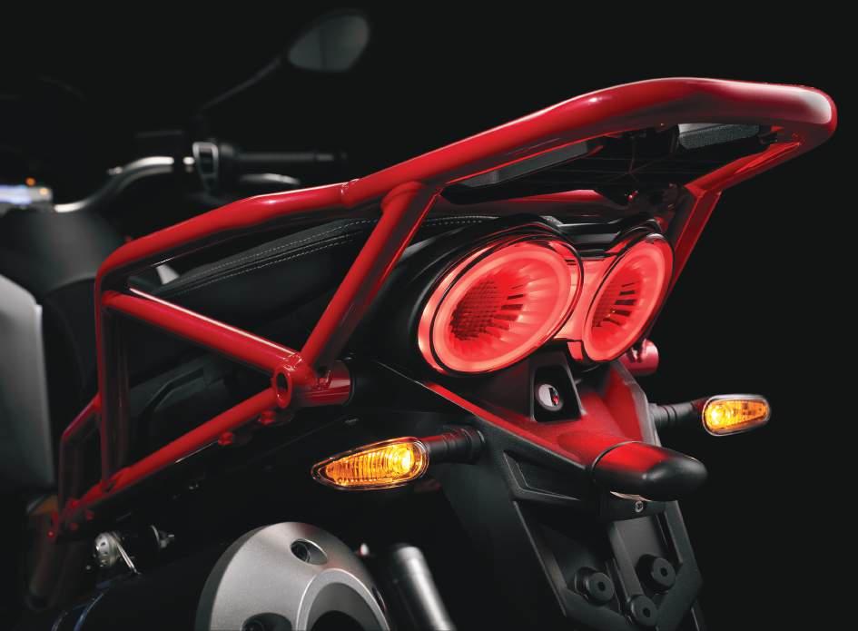 All travel parameters can be controlled via the digital instrument cluster complete with TFT display. The background and colour of the characters adapt to different light conditions thanks to a built-in sensor. The information displayed, in addition to the classic speedometer, rev counter, mileage counter and clock, also includes selected gear indicator, air temperature, fuel level, average and current consumption, residual autonomy and selected Riding Mode. It is also possible to set a maximum number of revs for the gear shift light sensor, useful when running in the bike or seeking to limit fuel consumption as far as possible. Alongside the display is a USB port while provision is made for a second port under the seat. The full LED headlight assembly, in addition to low and high beam functions, has a series of built-in daylight running lights (DRL) which,