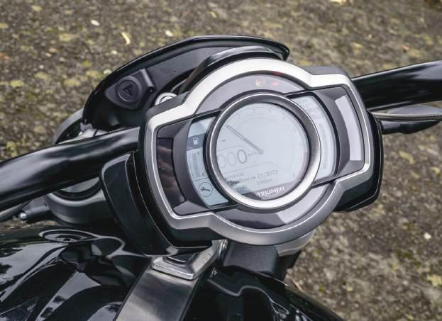 all LED lighting, four riding modes, cruise control, keyless ignition and traction control. The second generation TFT instruments are very smart. To start, it is adjustable in angle and the big thing is the ‘MyTriumph’ app. Connected navigation with directions shown through the TFT dash, Bluetooth, music, phone and volume can all be controlled through the left switchgear. You can also connect a GoPro and control it through the dash, and the ‘Bike Garage’ feature on the app allows you to view bike and ride information.