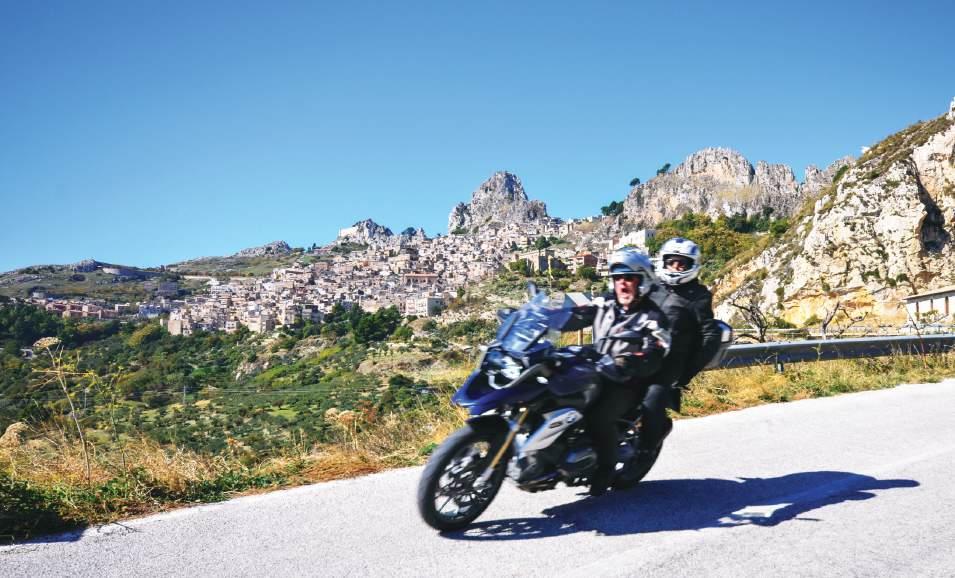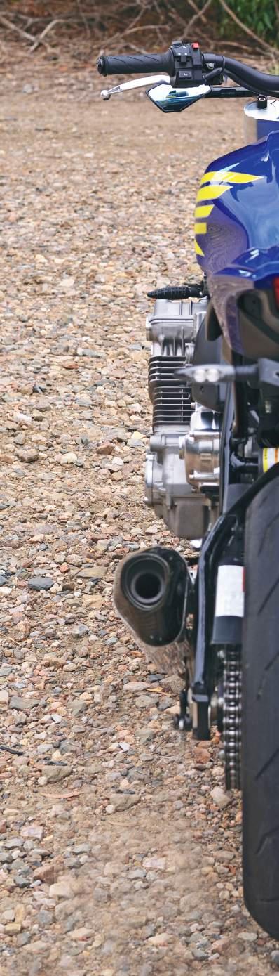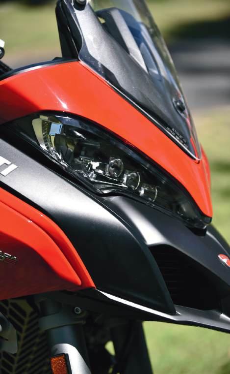 maximum torque in that useable band between 3500rpm and 9500rpm. That’s a hell of a wide spread for a V-twin. Peak power comes at 9000rpm, and peak torque is at 7750rpm. Anything more than 9000rpm and the bike runs out of puff before the rev-limiter can be found at 10,500rpm as the digital display flashes its red lights. I found 3rd and 4th gear the ideal duo for most of the speeds needed to combat the Bells Line of Road twisties on my way out to Lithgow for our photoshoot. Four riding modes are there to choose from - Sport, Touring, Urban and Enduro. I found Touring to be the best all-round combo as slow speed and light throttle inputs were smoother, but when the pace was upped, Sport was the go-to. Within the modes you can individualise traction control, power, ABS and the suspension.