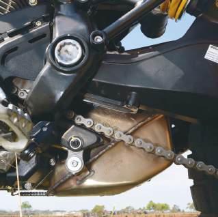 The Versys-X has no frame rails under the engine and the exhaust is also quite exposed, so a bashplate was manufactured to protect the frontmounted oil filter. A bigger foot was fitted to the sidestand, as any standard foot will just sink in to sandy surfaces.