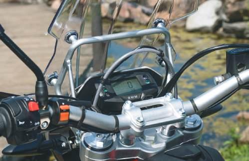 Kawasaki’s accessory socket ‘adventure option’, which also came with a wiring loom, was fitted to enable a cigarette-lighter plug. A bracket, which doubled as a GPS mounting point, was made to move the windscreen up higher than the standard for more rider comfort.