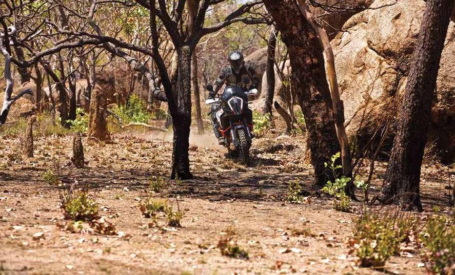 much with that kind of detail on this ride. Miles Davis made it look easy in his demo, but there was a lot we wanted to get through, so we took his word for it. Dynamic Pro did the bizzo chasing the pack along the asphalt and Enduro Pro gave us all the latitude we needed to get the most from the incredibly smooth donk. Switching to Enduro Pro via the press of a button – there’s no need to remove the seat to switch plugs as was the case previously – meant there’s no ABS on the rear and the front allowed some very aggressive braking. Maybe even a little locking – we can’t be sure about that, but that’s how it felt – and the rear wheel stepped out with the throttle open in the nicest possible way without any nasty surprises. Enduro Pro made us feel like real off-road riders.