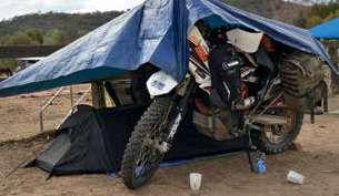 Molloy pub, and one passing truck playfully hooked up on the rear of another reversing from a parking spot and tore away large sections of bodywork, one of the camera guys emerged from lunch to find his DR-Z camera bike had a flat tyre. Before anyone could say, “Geez. I hope someone here will fix that,” Jordy had thrown the thing up against a tree, wrenched the rear wheel out, effected a repair and had the whole show ready to run again.