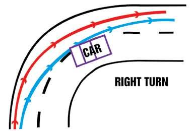 A right hander using the Rural (red) Line is slightly J-shaped, allowing more of a gap to the centre line and a wider view of the exit, providing more choices if needed.