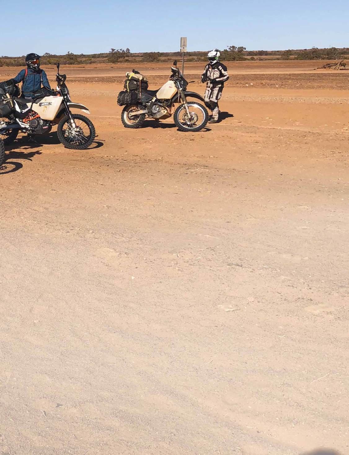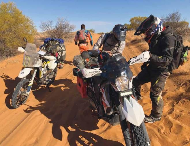 Discussion at the stop revolved around how far the lead rider would travel before checking everyone was together and moving forward. All options were considered, and it was agreed to use the cornerman system. Once in the desert this also meant stopping regularly to ensure the distance between the lead bike and sweep bike wasn’t too great. Simply stopping at the top of a dune and making sure the bike behind was still