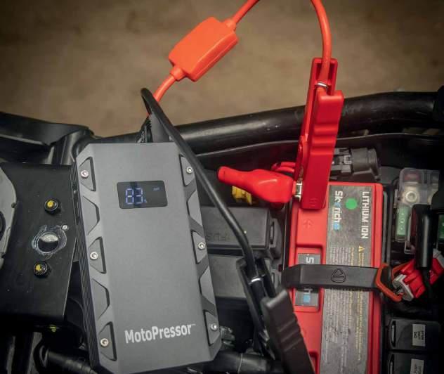 smaller and lighter it is just as powerful. It still pumps over 130psi and will inflate a 150/70 R18 tyre from zero to 31psi in three minutes. All with a weight of 345g and size of 100x74x35mm. It has a cooling fan and comes complete with an inflation hose and a two-metre power cord fitted with an SAE connector. There’s also an SAE-equipped set of alligator clips if you don’t have an SAE connector on the bike. All this fits in a neat zipped and padded pouch.