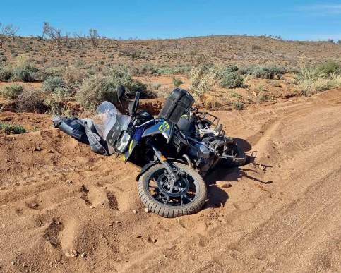 I help Jimbob out from under the bike and we get the mighty DR upright. Now this is Jimbob’s first big ride and first stack to boot. It’s fair to say he’s a bit dishevelled at this point. Not hurt, but let’s say in a bit-of-a-spin. He gets the bike going and scoots off, I follow, he takes the right instead of the left fork which clearly has the tire tracks on it. I beep my horn and he turns around, then goes bush to find a tree to straighten his steering on.